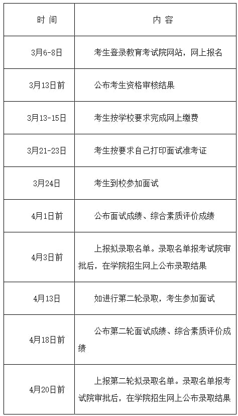 (6)3月13日前,学校招生网公布考生资格审核结果;3月13日—15日,考生按学校要求完成网上缴费,收费标准为60元/生;3月21日—23日,考生自己完成打印面试准考证;面试时,考生必须持准考证和身份证双证方可参加;面试期间,考生交通、食宿费用自理。